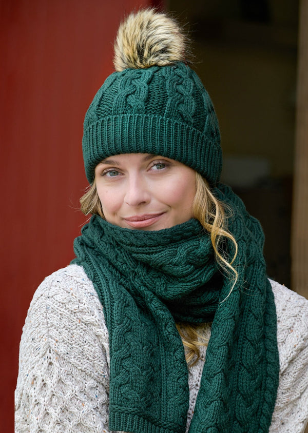 This Aran Cable Knit Cedar Pom Pom Hat is crafted from 100% Merino wool for unparalleled warmth and comfort. It's designed with a traditional aran cable knit pattern, and an eye-catching faux fur pom pom for a chic finish. Perfect for the cold season.