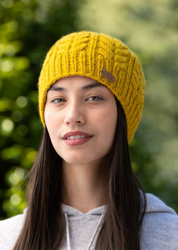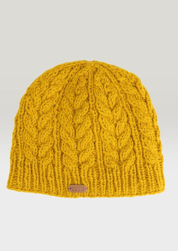 Expertly crafted in Ireland by Erin Knitwear, this Aran Cable Pullon Hat features a timeless color and intricate cable pattern. Made of 100% Wool with a soft and warm polyester fleece lining, this hat is the perfect accessory for staying cozy on chilly winter days. Its versatile one size fits comfortably for head sizes 55cm to 61cm, complete with a branded Erin label. For best care, we recommend hand washing and gently squeezing out excess water before laying flat to dry.