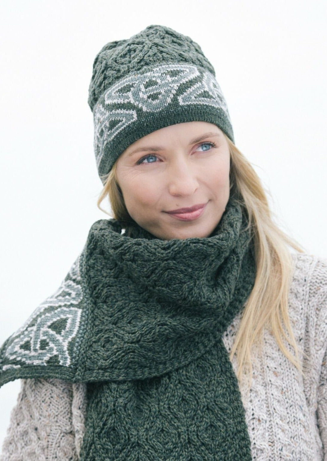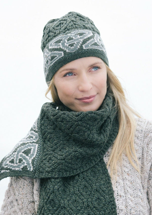 The Celtic Jacquard Wool Hat | Green is crafted from 100% Merino Wool and showcases a beautiful cable design. This traditional Aran Cable pattern knit hat features the main focal point of the stunning Celtic Trinity knot Jacquard design. This stylish and cozy Irish Hat is perfect for staying warm during the winter months.