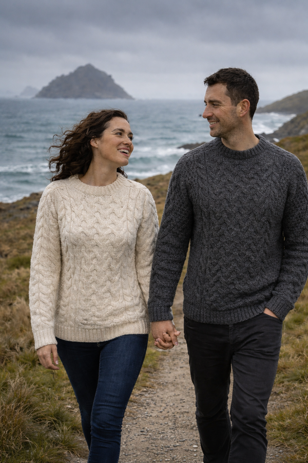 Aran Woollen Mills knitwear is made with 100% natural wool. The yarn and processes are sustainable and ultimately owe to versatile clothing for your wardrobe that can be worn often and washed less. Aran Woollen Mills knitwear comes in a range of traditional and contemporary yarns and designs, and makes the perfect authentic Irish gift for yourself or your loved one, delivered direct from our store on the Wild Atlantic Way.