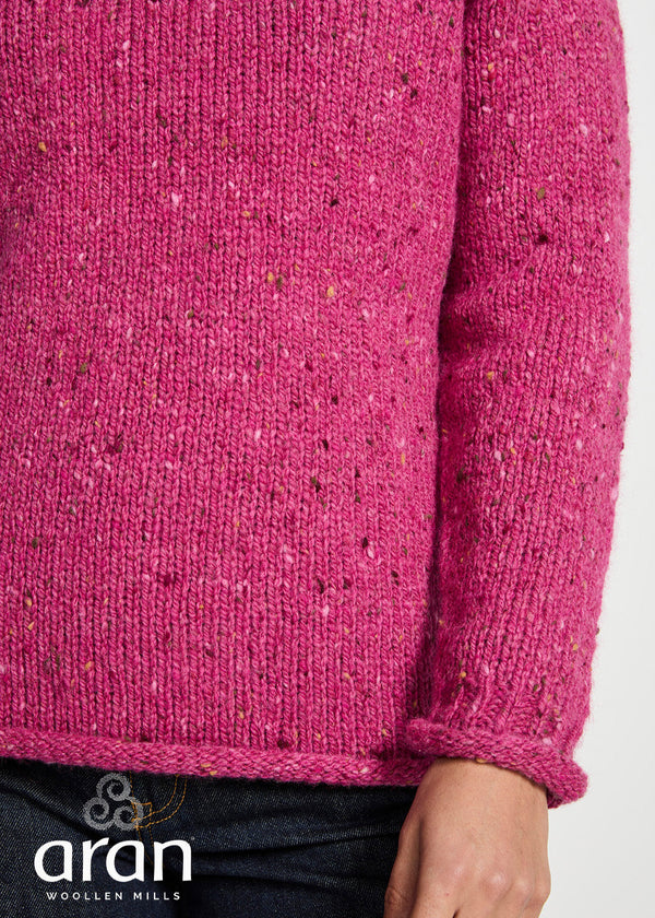 This Ladies Donegal Roll Neck Sweater in fuchsia is a great addition to your weekend wardrobe. Made from 100% Pure New Wool with a tweed-like feel, it features comfortable raglan sleeves and rolled neck, cuff, and hem for a casual, yet stylish look. Fully linked seams provide a premium finish and the medium weight fabric ensures a perfect fit.